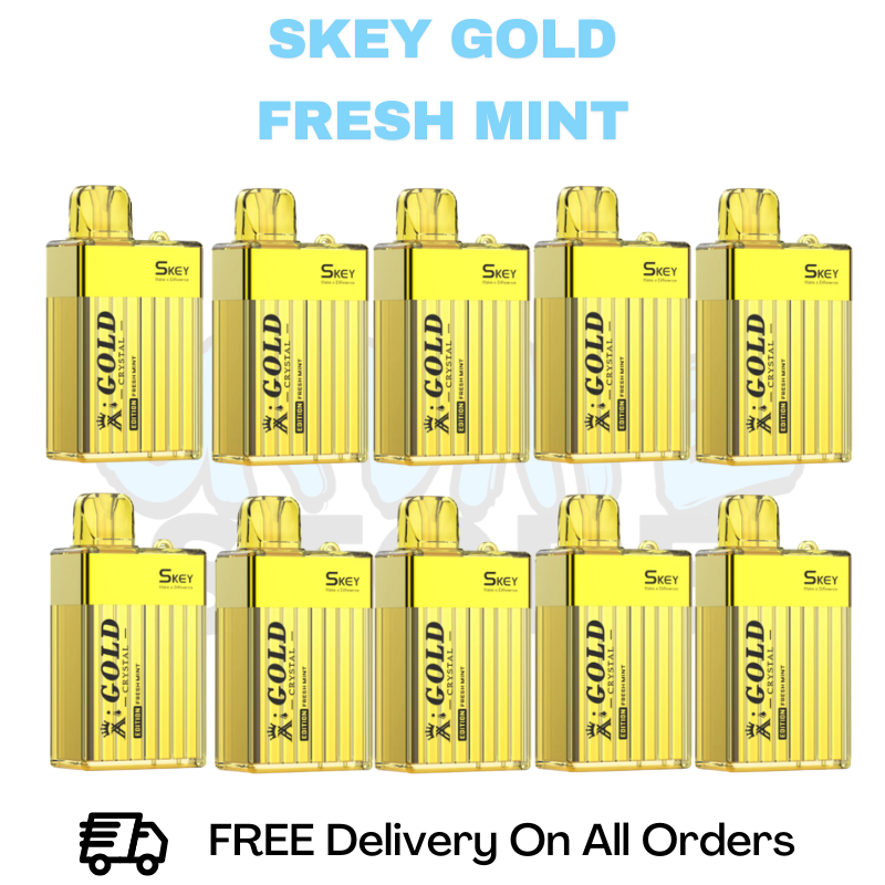 Shop Fresh Mint SKEY Crystal Gold 600 Box of 10, Each sleek and portable disposable vape offers the perfect blend of refreshing mint for a cool taste delivering up to 600 puffs of flavorful satisfaction. It's a perfect addition to the SKEY 600 Range!