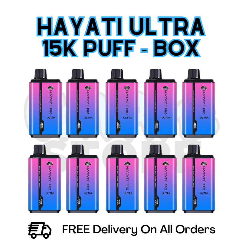 Stock up on your favorite flavor with the Blue Razz Gummy Bear Hayati Pro Ultra 15K Puffs Box of 10. Each device offers a massive 15,000 puffs with a delightful flavor that combines the sweet, tangy taste of blue raspberries with the chewy, sugary essence. With 10 devices in one box, this pack provides long-lasting convenience and unbeatable value for just £85.99.